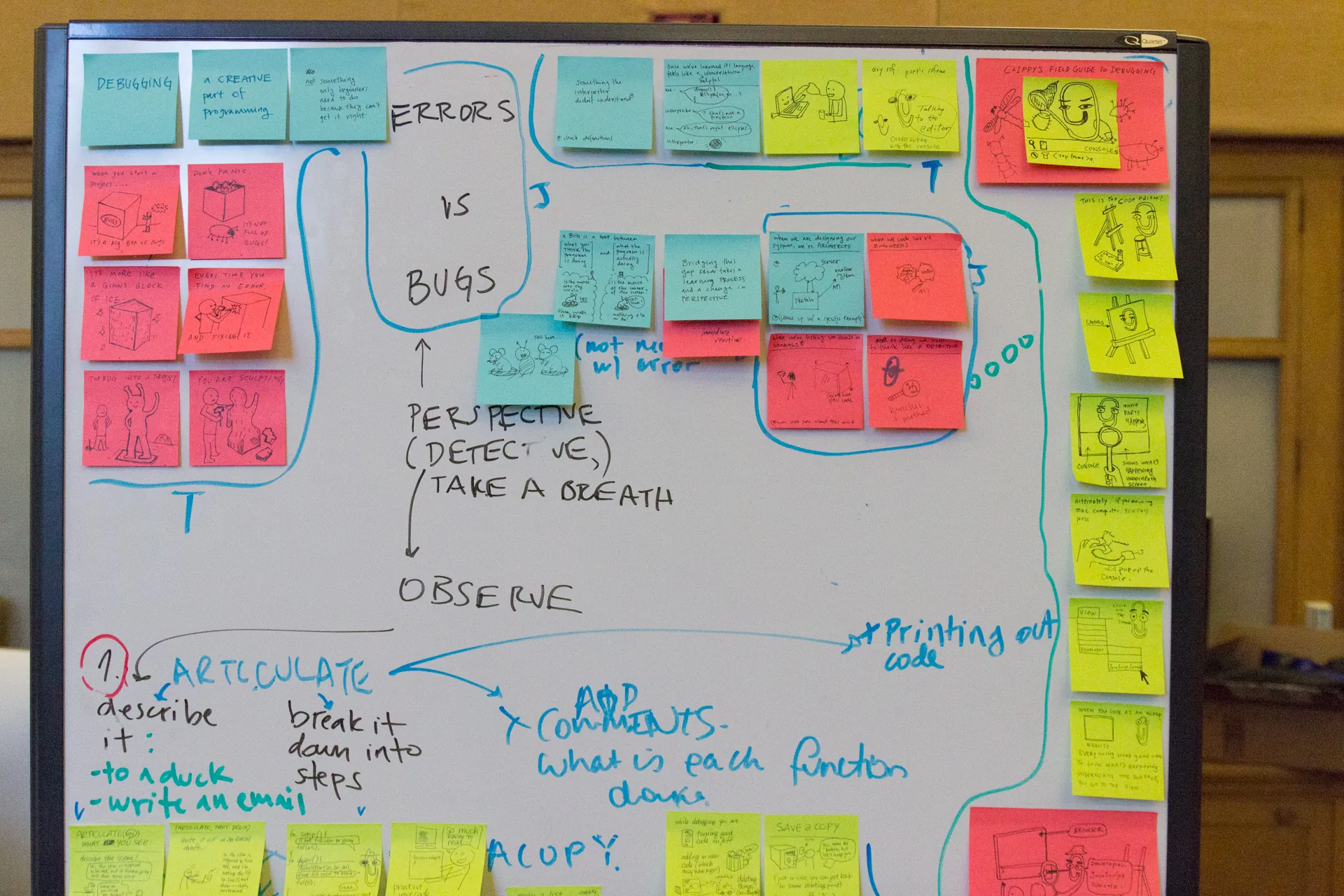 Participants sit in a circle around a white board with sticky notes on it while a female student speaks into a microphone